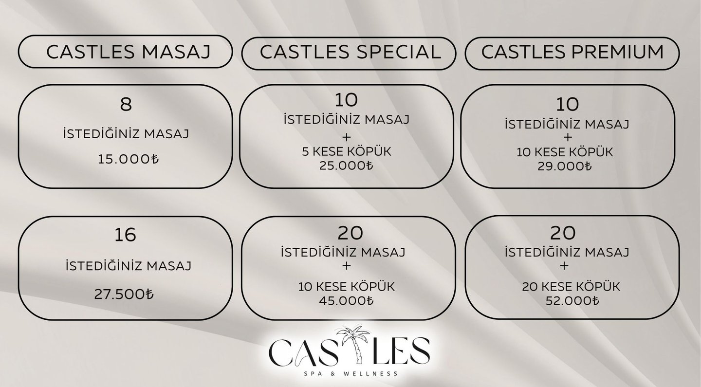Castles Spa Premium, müşterilerimize en yüksek kalitede masaj ve spa hizmetleri sunma amacıyla kurulmuştur